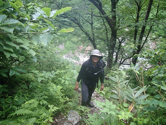 池ノ谷へは、白萩川の雷岩付近で徒渉し、小窓尾根に取り付きます。急登を1時間かけてハイク、1600m地点で池ノ谷側に下ります。ここまでの登山道は、地図上にはありません。ここも地元の山を愛する方々の手で整備され、支えられているコースです。