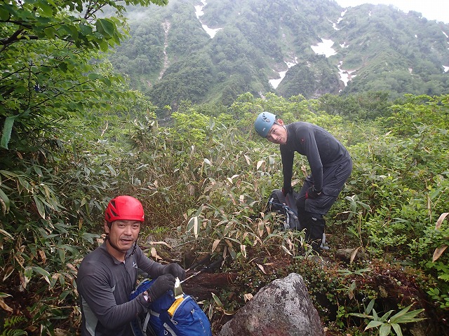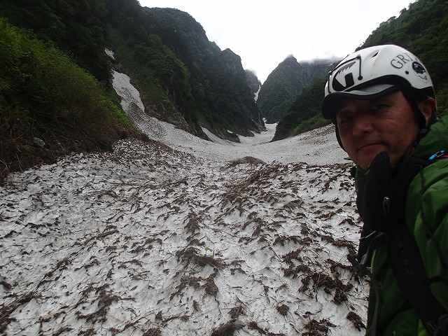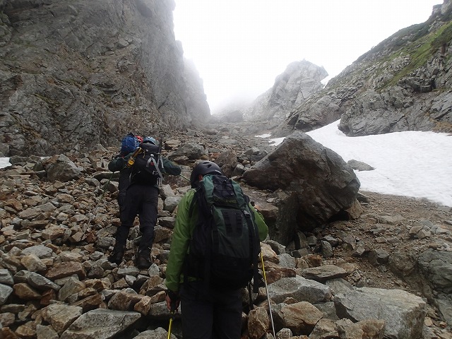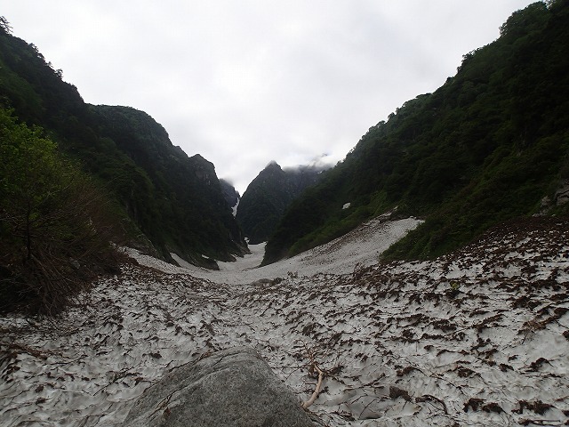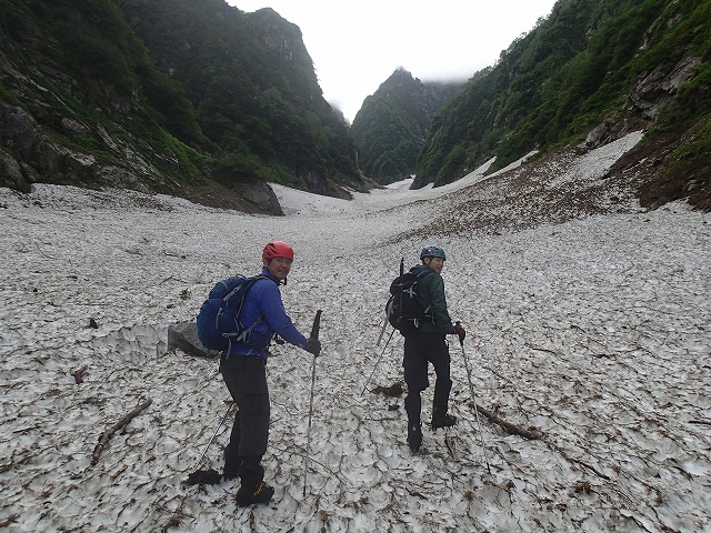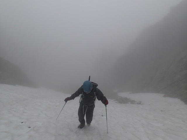 約3時間、池ノ谷の雪渓に着いたころには、体力は相当奪われていました。渡渉後の急登と気温の上昇が重なったからのようです。池ノ谷からが本格的な登山の始まりです。まずは、アイゼンを装着し三ノ窓を目指します。雪渓のハイクは、毛勝山、南又谷と経験してきましたが、迫力が違います。2時間40分ほどで三ノ窓に到着です。到着と同時にガスが立ち込めてしまいました。