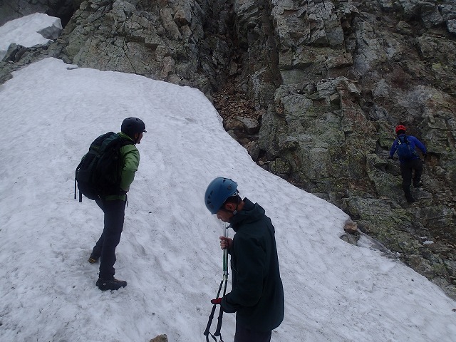 できるだけ長次郎の谷側を通過するよう心がけます。時には、右側を通過しなければならないところも出てきますが、雪と岩の間の通路を探して進みます。