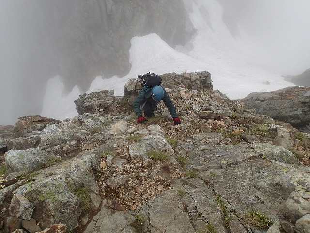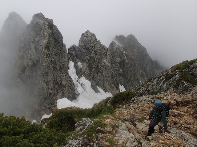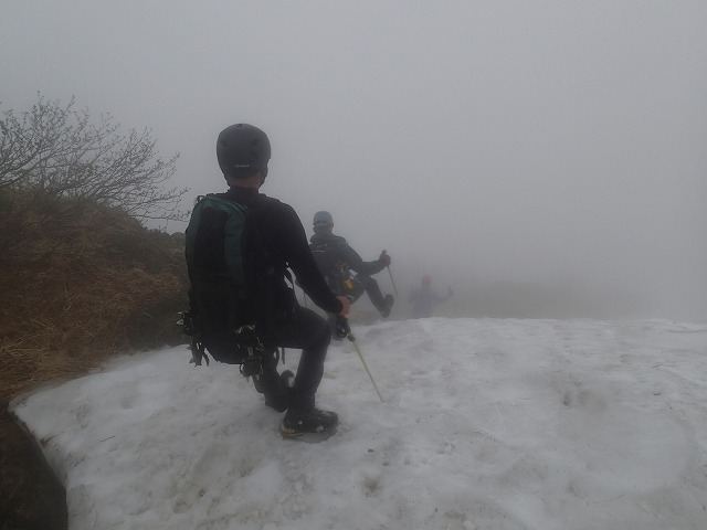 後半の1/3には雪が残っていたのが救いとなり、アイゼンをつけて直登することができました。鞍部に到着した頃には、周りはガスの中。昨年の体験を活かし、正規ルートをたどることに。