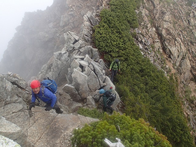 「長次郎の頭」まで来ると、私と大ちゃんは、左側から下降。梅さんと天狗蔵君は右側から下降。両方から通過することができました。このコースを通過するのにはやはり経験が必要です。安易な気持ちで通過できるコースではなさそうです。その後は、稜線づたいに山頂を目指します。