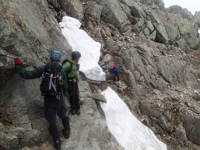 最初のロッククライムも難なくクリアー。尾根づたいにテントが張れる大岩に到着。まだまだ雪が沢山あります。概ね尾根沿いに進むことができるのですが、岩棚のバンドで苦労することに。足場が崩れスリングに頼らなければならずハラハラドキドキ、スリリングな通過となりました。その後は、雪と岩の境目を利用するなどしてうまく進むことができました。