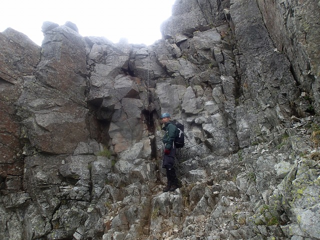 一番緊張した、岩棚です。スリングがぶら下がっていますが、昨年は、それに頼らず通過できたはずです。足場が崩れていたのかもしれません。