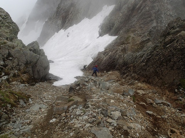 急斜面に雪がついています。アイゼンを付けたり外したりしながら下るしかありません。