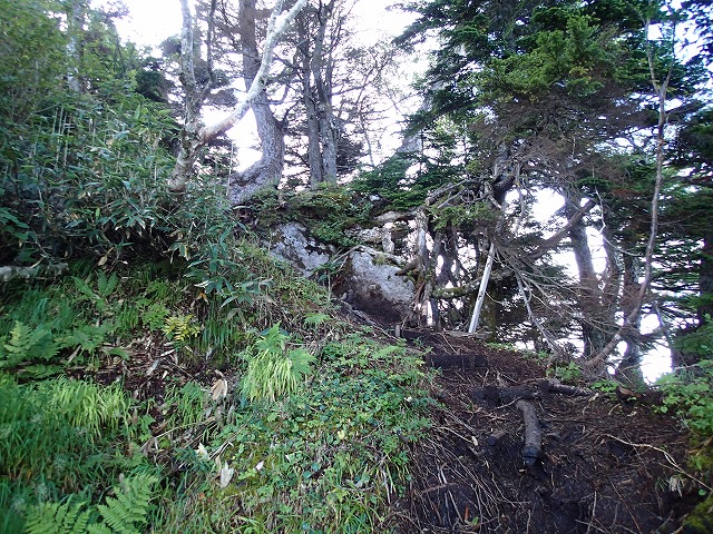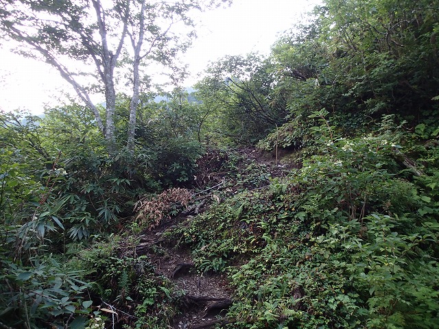 何処まで行っても急勾配の連続です。樹の根っこが濡れて滑りやすく、バランスを崩すことしきり。