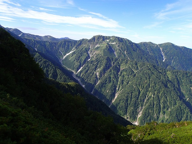 奥から毛勝三山 真ん中赤谷山~白ハゲ 手前が小窓尾根。北方稜線の山々です。
