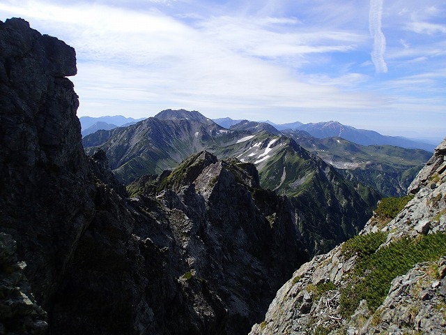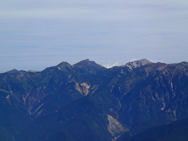 左の鹿島槍~爺ヶ岳~針ノ木岳方面の山々。