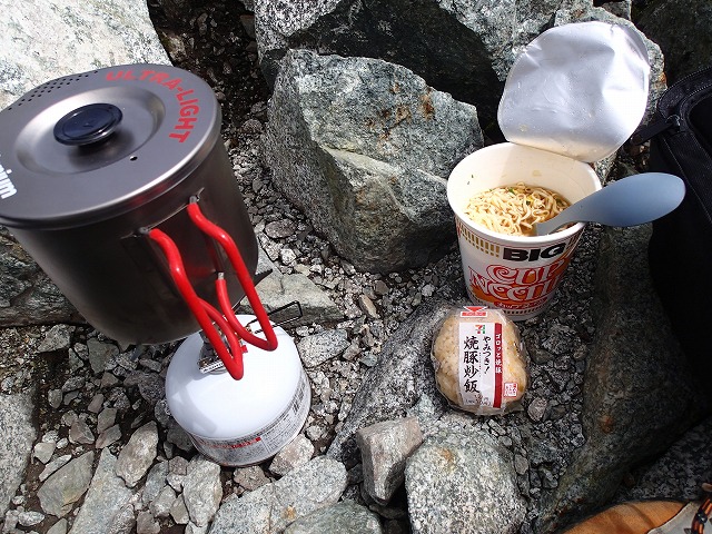 山頂では、お湯を沸かしてカップヌードル・おにぎり・コーヒー・アミノバイタルをしっかり補給。