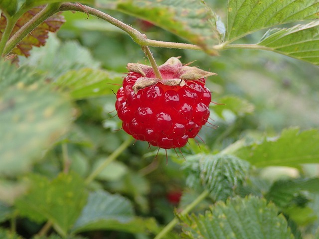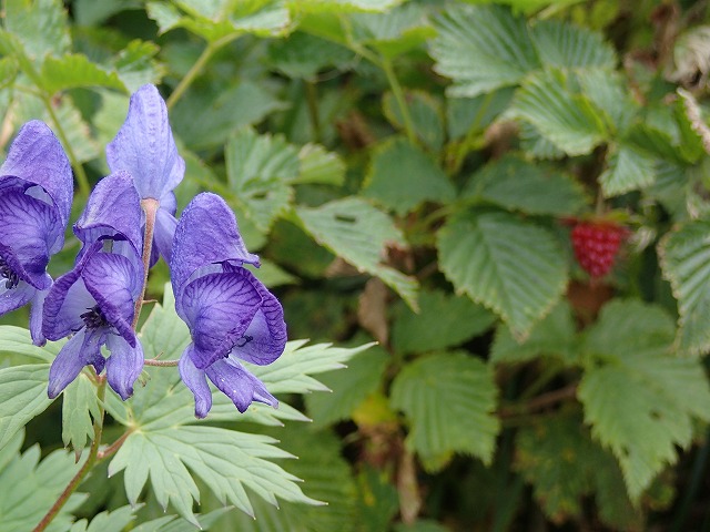 一番目に着いたのが「トリカブト」毒々しい紫色が特徴です。「ベニバナイチゴ」は赤い実を付けており沢山食べさせてもらいました。ほのかに酸っぱく自然の甘さがでています。