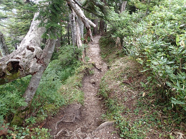 13:17 小屋を出発。樹林帯に突入します。