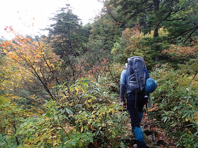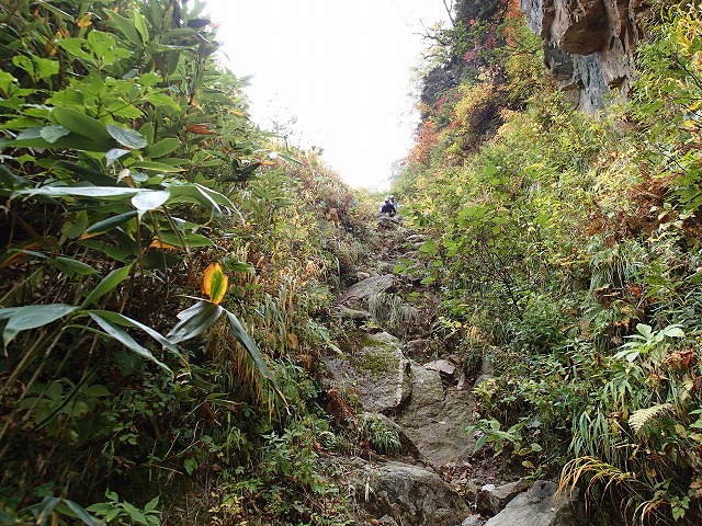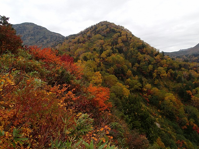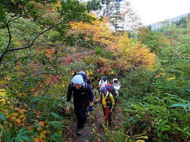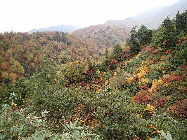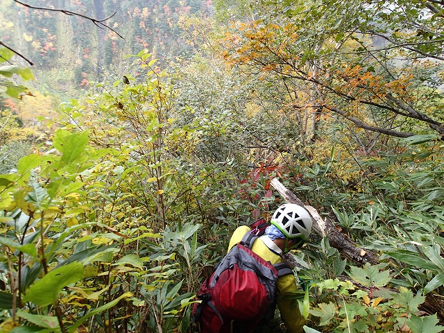 12:58 笹藪から細い谷筋に出ました。視界が一気に開け、対岸の紅葉が目に飛び込んできます。