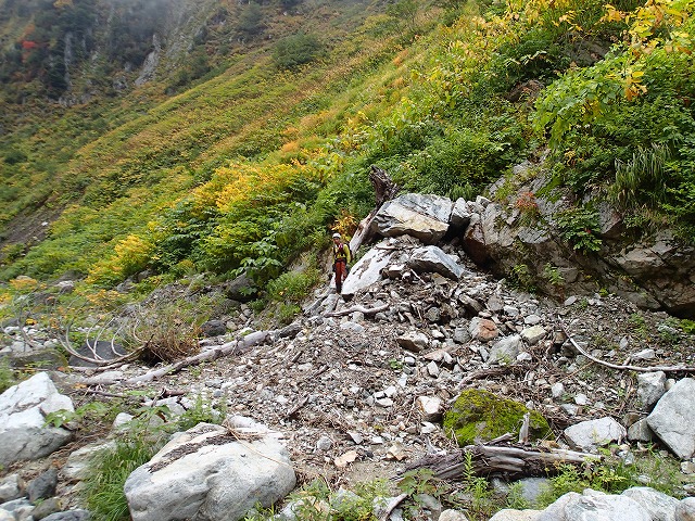 河原が見えてきました。ここに少々急な斜面がでてきます。