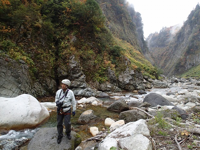 13:38 河原に降り立ちます。目の前には、なかなか目にすることのできない称名渓谷の紅葉風景が出迎えてくれました。