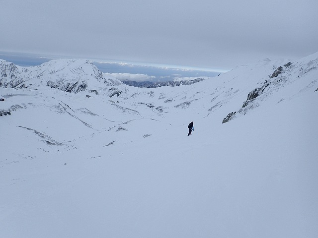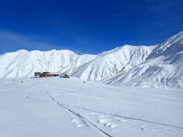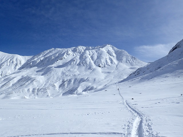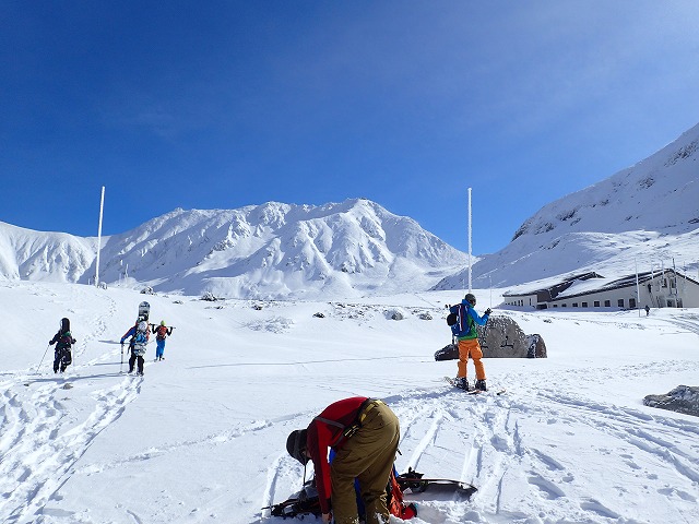 「この時間だから、浄土か雄山1本やね。」そんな会話を交わし、吸い込まれるような青空の中、久々のBCスキー出発です。細板ですが、しっかりトレースが付いているため、何の心配もありません。浄土山方面に向かってみましたが、全体に雪が薄いため、こちらの斜面は断念することに。