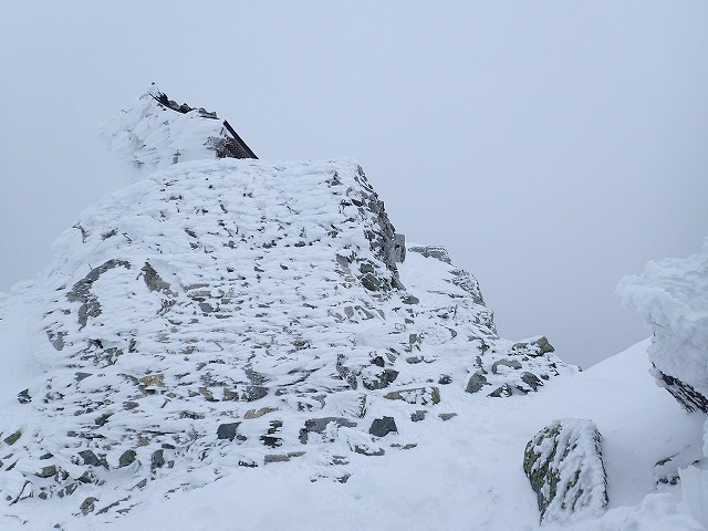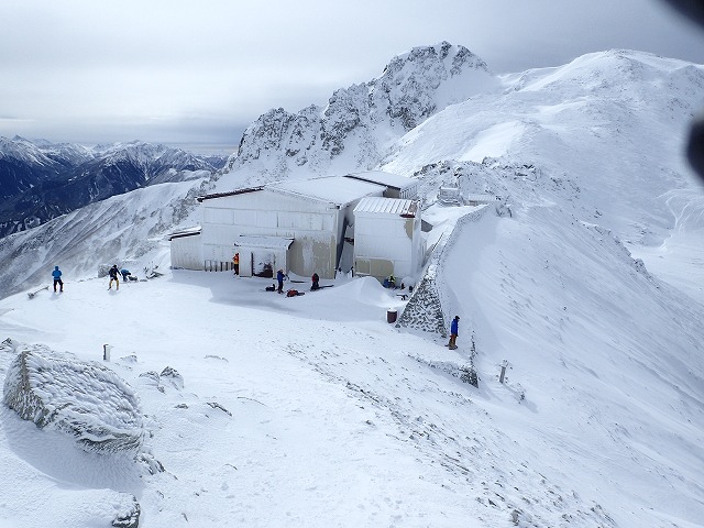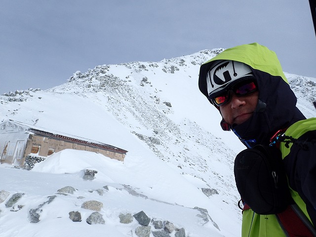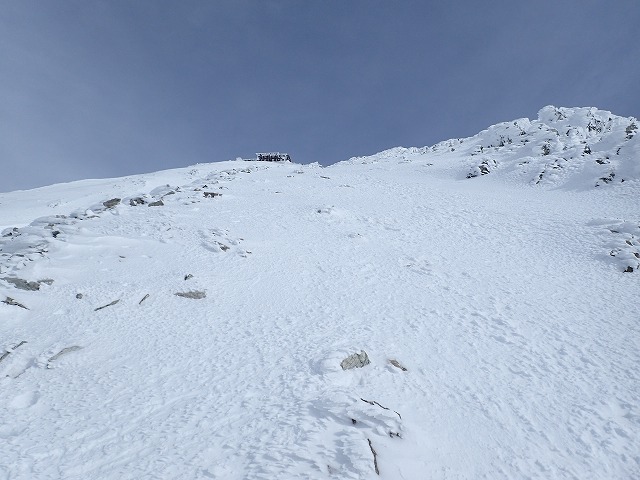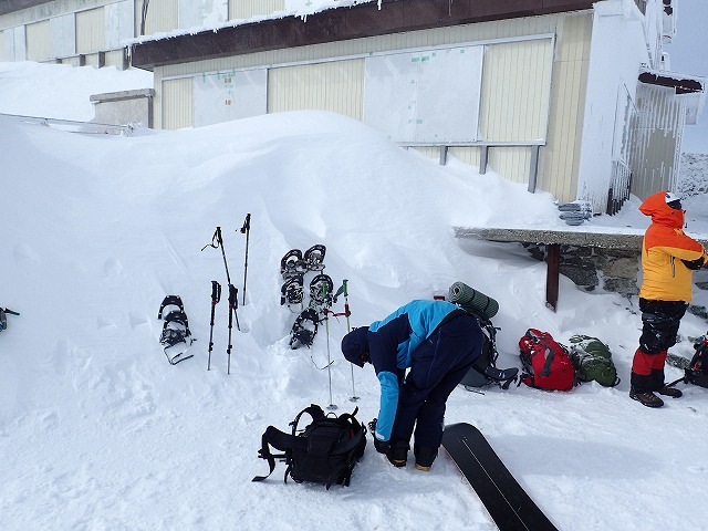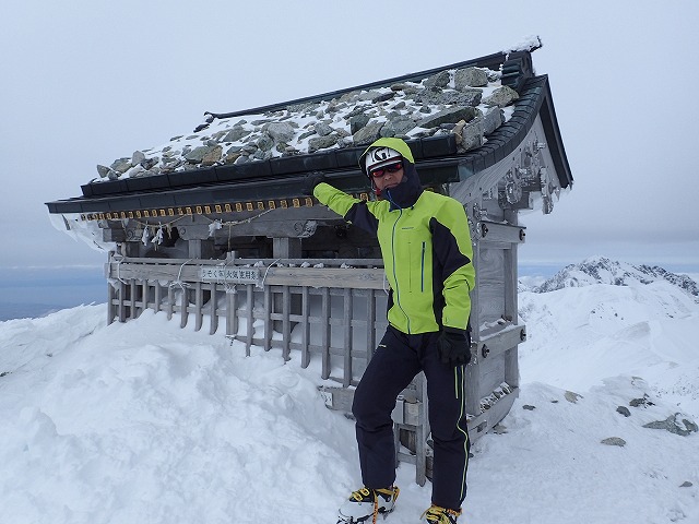 社務所までの登りは、雪が適度にしまってアイゼンが気持ちよく効いて快調にハイクすることができました。ただ風は強いのですが。