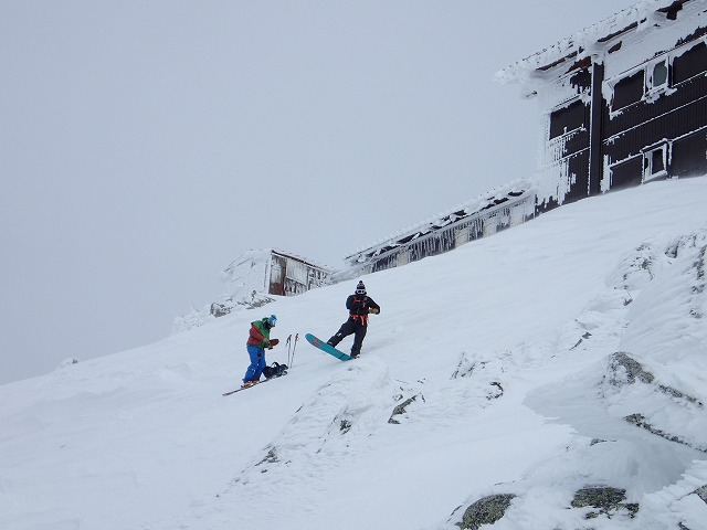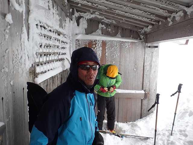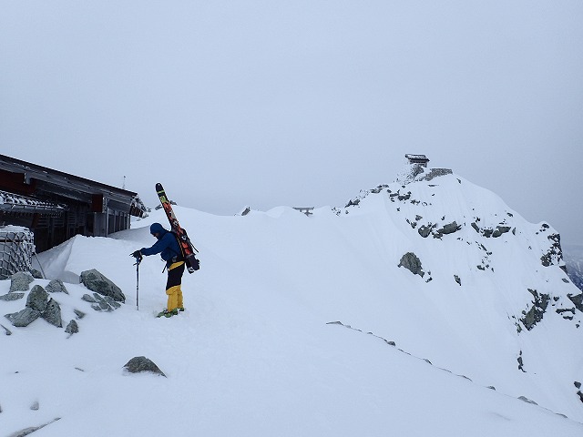 社務所の陰に入ると風もまったく気になりません。おにぎりで腹ごしらえして、滑降の準備に取り掛かります。今日は、何人もここから滑降しています。