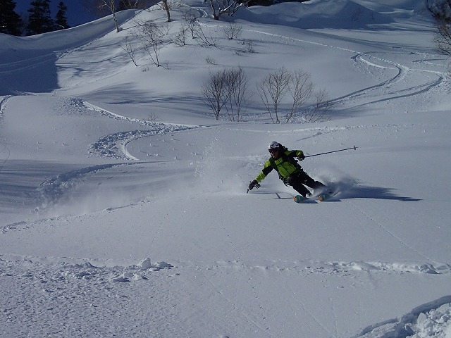 即座に自分の滑りを変化させたり、意識を変えたりして修正することができます。講習内容は、身体(股関節)の使い方や身体の向き、力の加え方等々細かく指示されます。