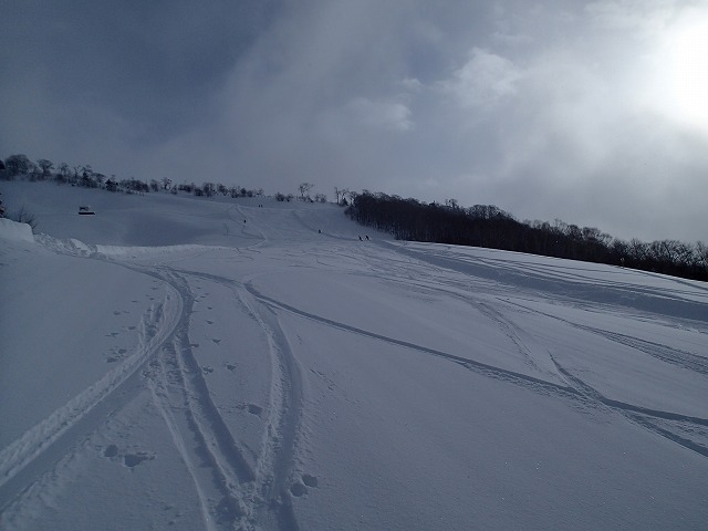 トレースを見ながら滑降ラインを選んで滑ります。名古屋の若者も細板ですが安定して滑っています。