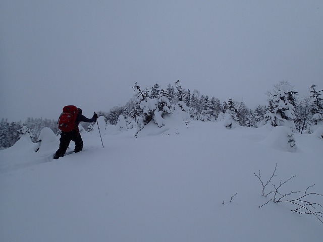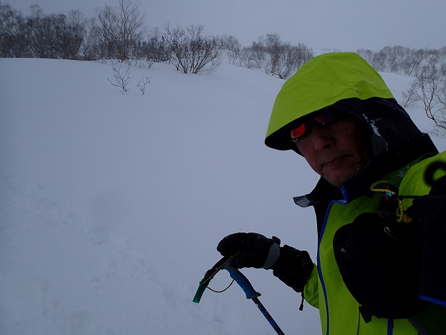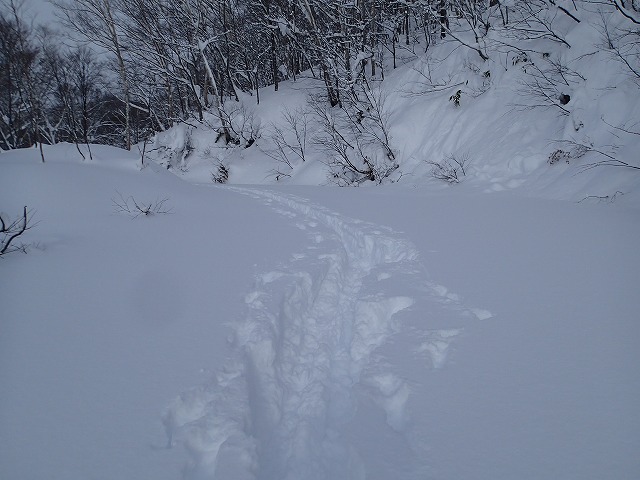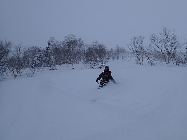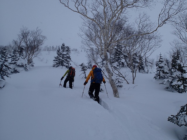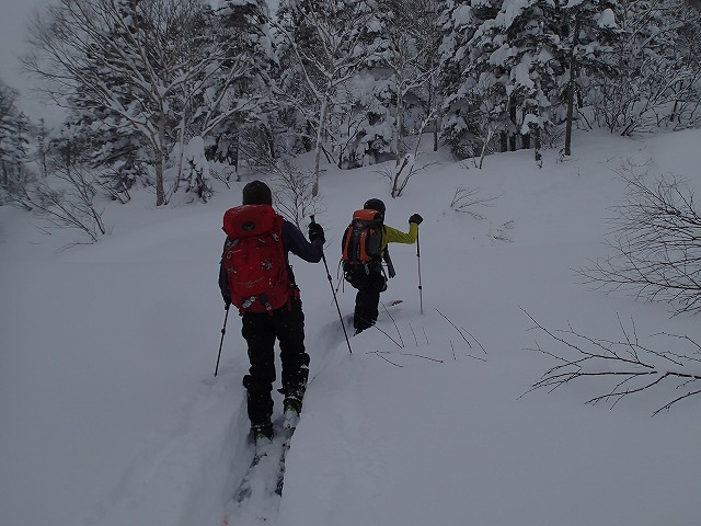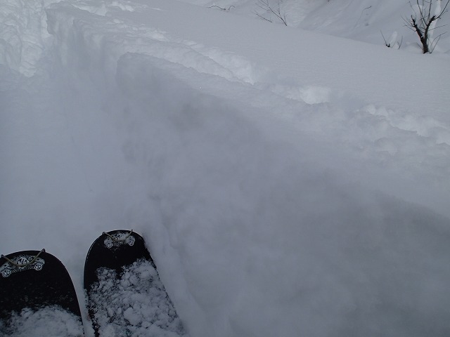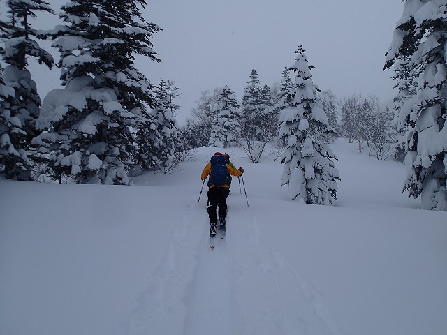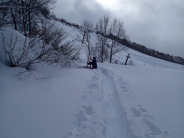 久々の激ラッセルです。まだ、地形が安定していません。樹木も多く、でこぼこした斜面になっています。