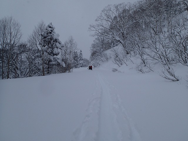 早稲田小屋を通過し、林道に出たところで先頭の2人を発見。相当強い2人です。ガンガン新雪を攻めていきます。