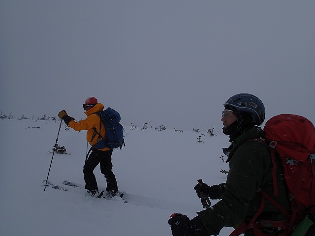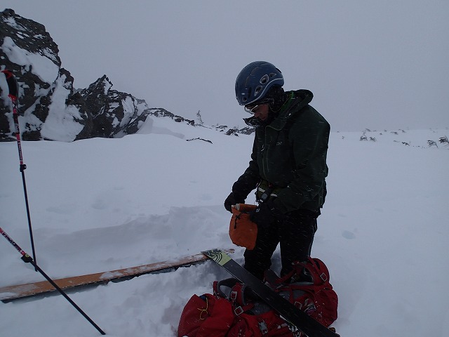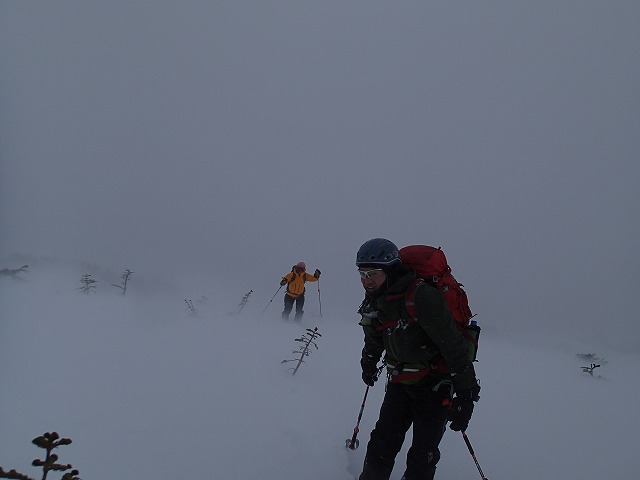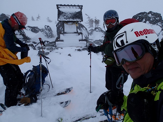 後半、名古屋からの若者を加え、北出さんと3人で、天狗原の祠へ向かいます。天狗原は風も強く、-13度の世界でした。シールを外して滑降しようとするのですが、スキーが滑ってくれません。寒すぎてワックスが合わないようです。