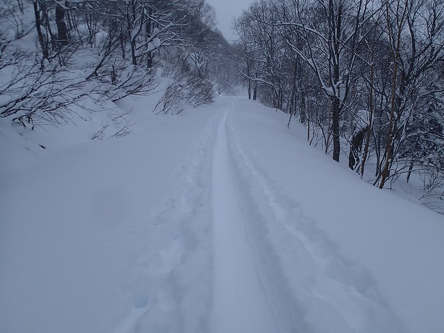 踏み跡を発見し林道へ。トレースの深さは、80cmはあるでしょうか。最初に入山した方は大変だったことでしょう。