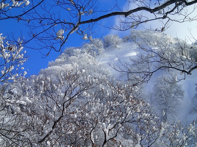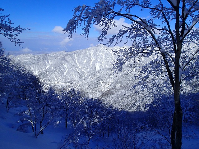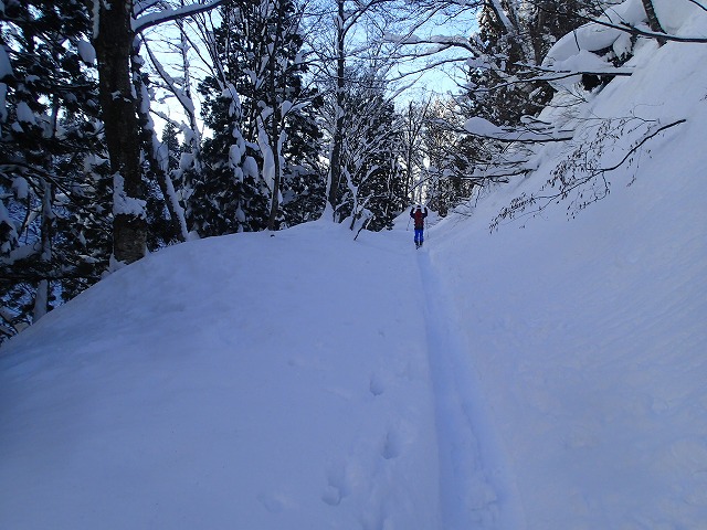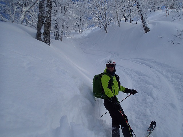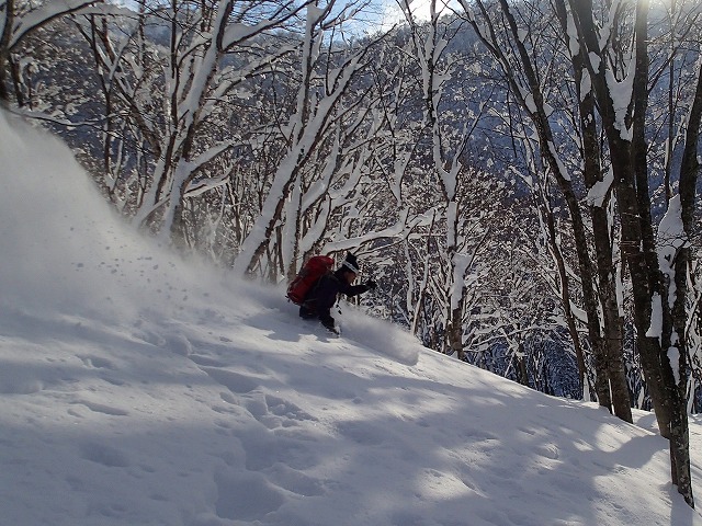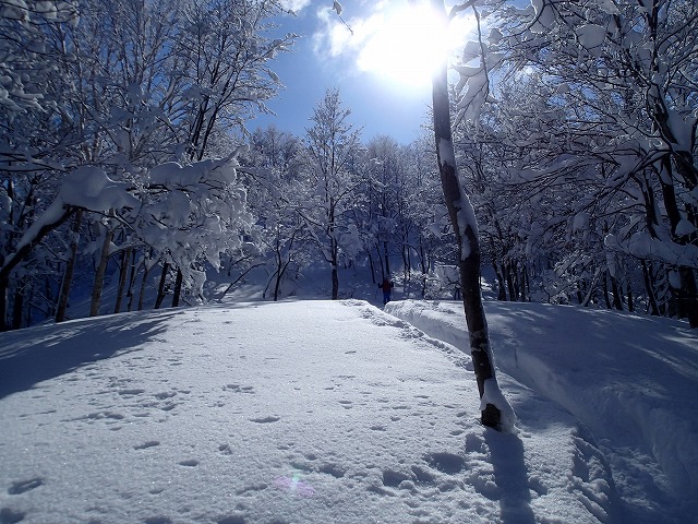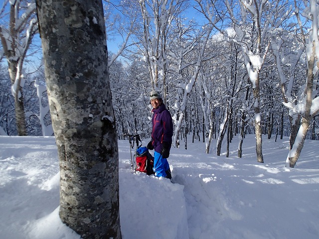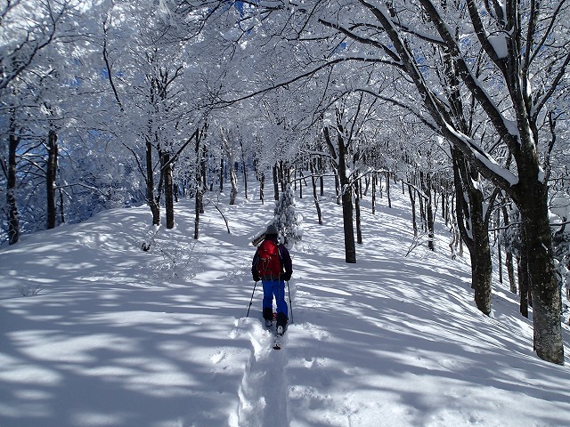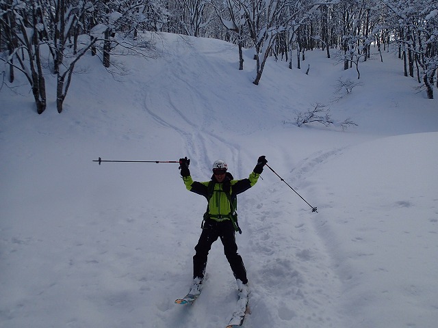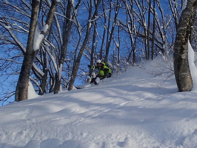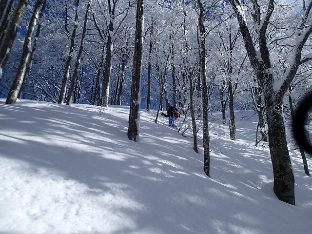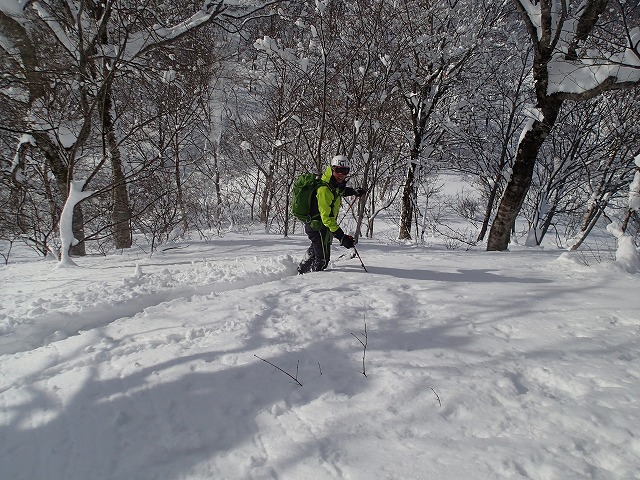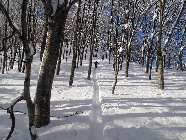 ツリーランは、私たちの得意分野です。まるで回転競技をしているように樹木の間をすり抜けていきます。大品山からはトレースもしっかり付いており迷うことはありませんでした。