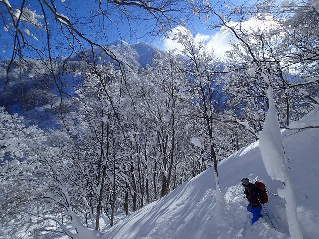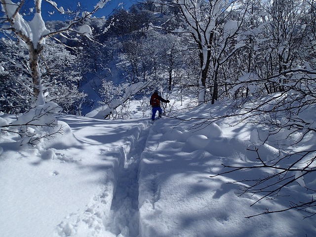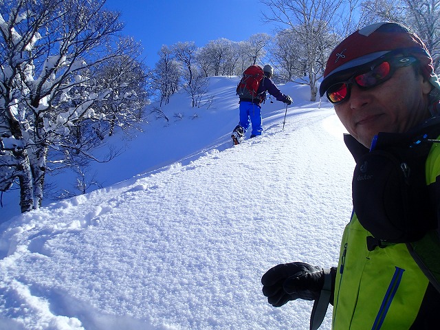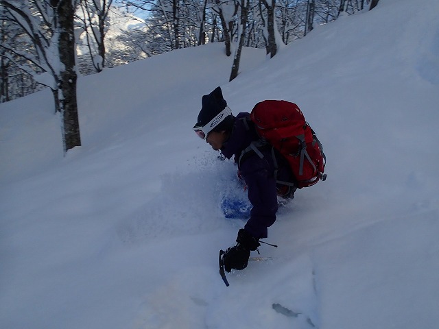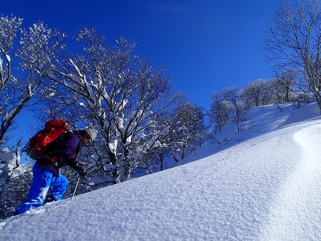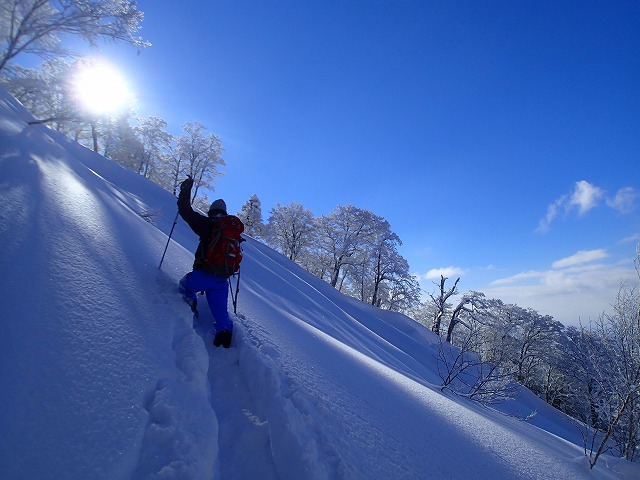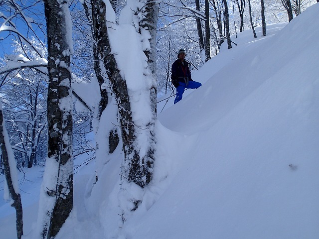 斜度が急になり、トラバース気味に進みます。新雪は、50cm以上。帰りの滑降が楽しみとなります。