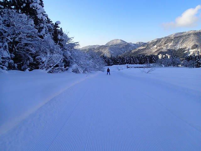 帰りは、粟巣野スキー場内を滑降し、クロスカントリーコース沿いに、雷鳥バレーに向かいます。