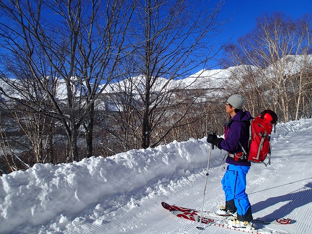 パウダーを味わった後は、鵯尾根に上り返します。途中エネルギー補給しながら、尾根伝いに進みます。