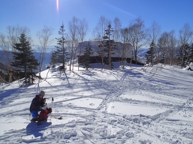 祠の少々上まで一気に滑降です。ここの斜面は、新雪パウダーとはいきませんが、しっかりスキーが食い込んでくれ、楽しい滑降をまずは行うことができました。