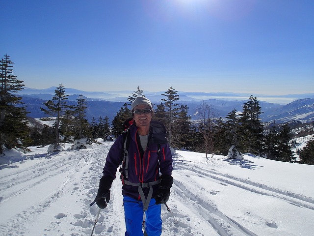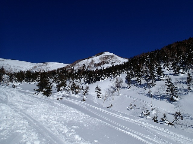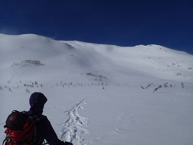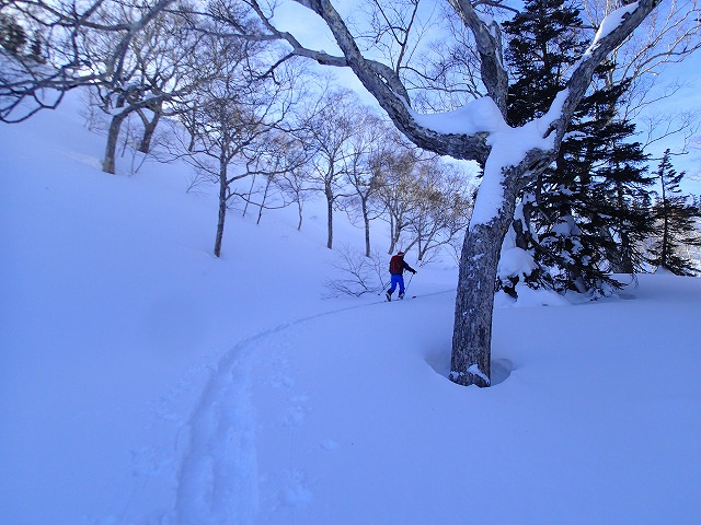 ここの斜面の雪は、クトーをつけないとずるずる滑る時もあるのですが、今回はシールがよく効いてハイクスピードも上がります。