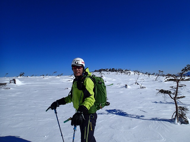 14:00 シールを剥がし、尾根上を滑降していきます。樹木が混んでいるためスピードが出せません。右にいい斜面があるのでそこを下ると、とんでもないことになります。あくまで尾根の上。