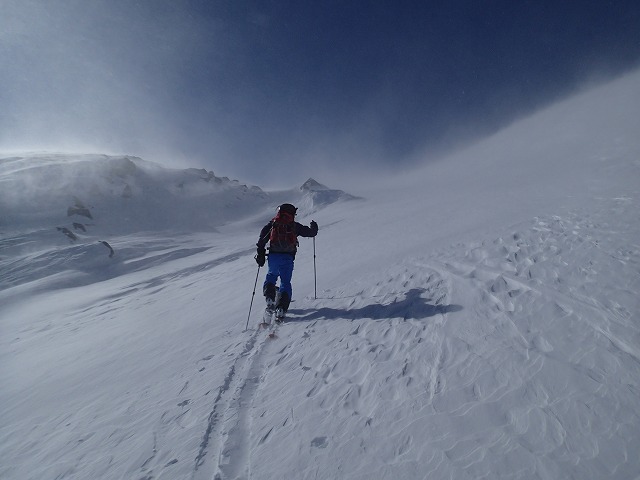 強風が吹き始め、気温も急激に低下。体感温度は、-20度ぐらいだったのでは。前を向くこともできません。