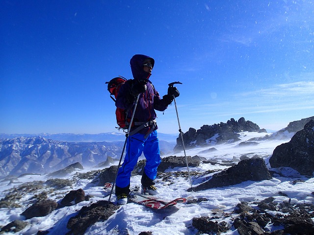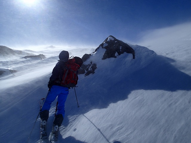 11:23岩陰を見つけ、風を少しでもさえぎってもらいながら、滑降準備をします。あまりの強風にスキーが飛ばされないよう気を配りながらの準備となります。