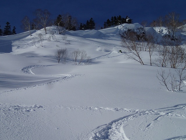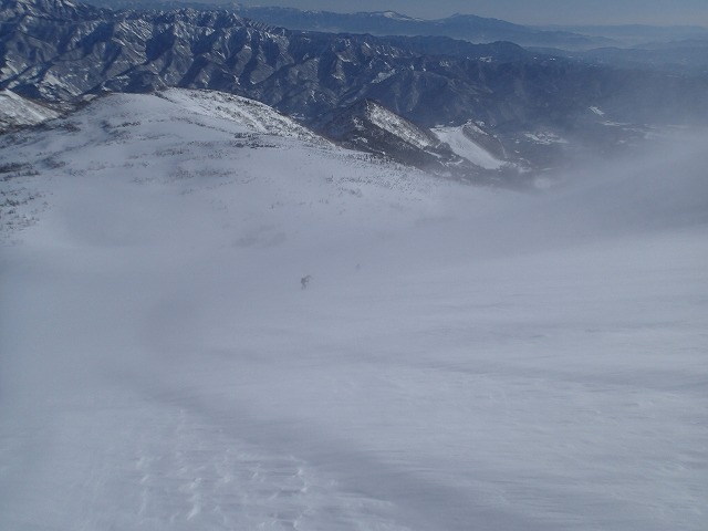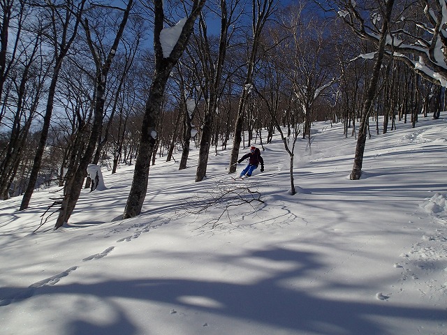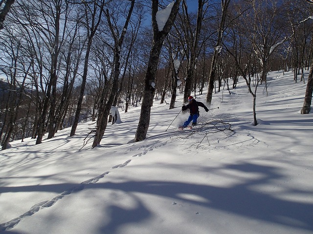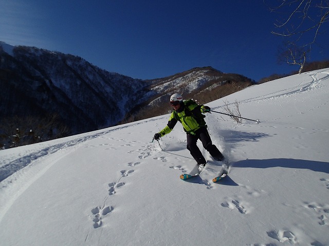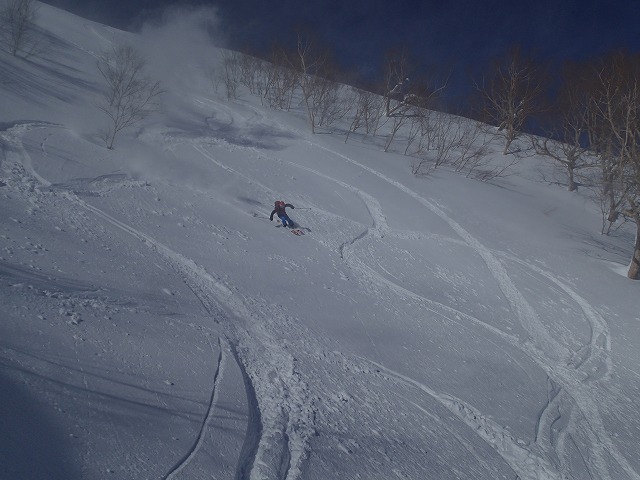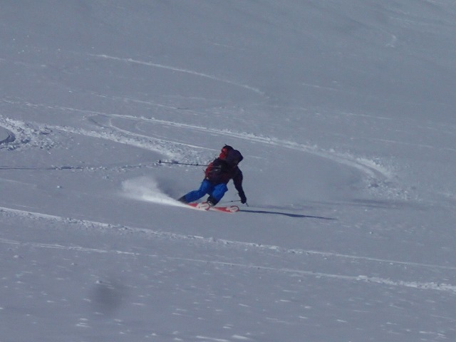 天狗蔵君も気持ちよさそうに降りてきます。適度にスキーが雪面に食い込み、一番滑りやすい状態でした。