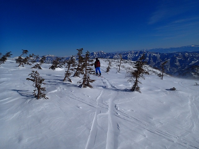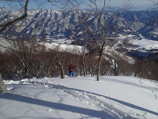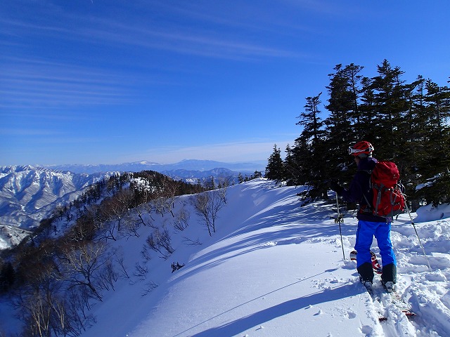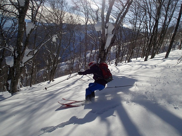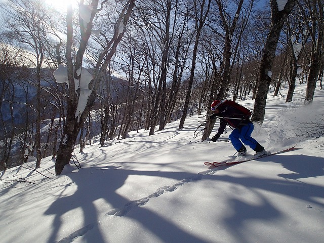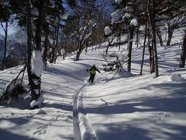 14:00 鵯峰で滑降準備を行い、左の尾根沿いに滑降していきます。尾根沿いから外れないよう注意しながら樹木の中をぬっての滑降が続きます。