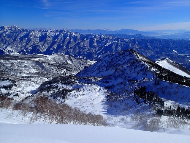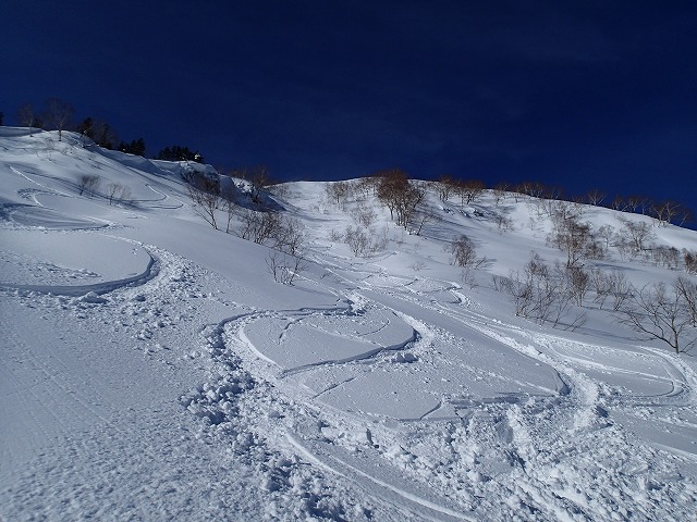 滑降してきた裏鵯斜面。1日ここで過ごすのも楽しいかもしれません。1日4本は行けるでしょう。1回5分で滑って、45分のハイクといったところでしょうか。