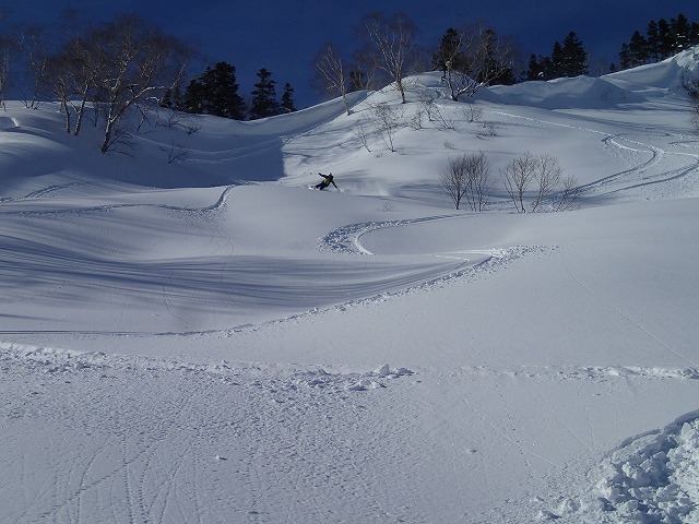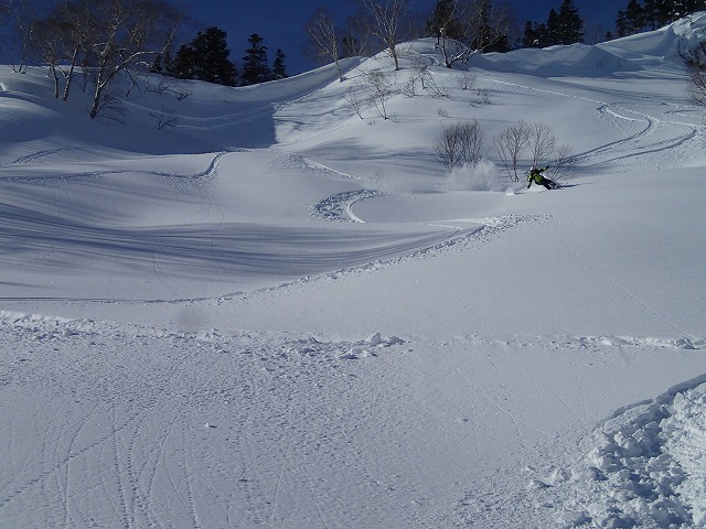 斜面をのぞき込むと最高のパウダー斜面が待っていました。