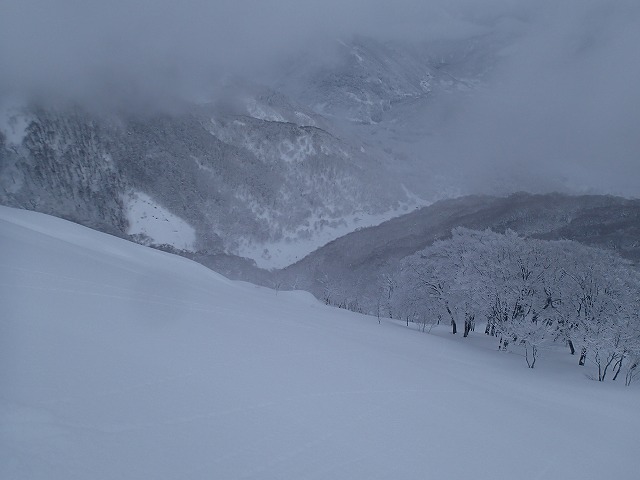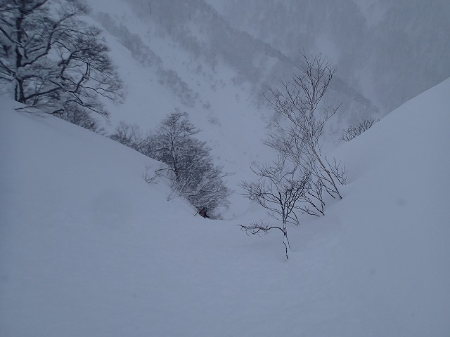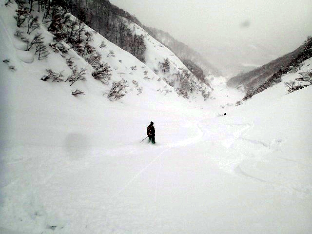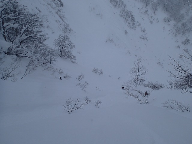 トラバース中に下の斜面を覗いてみました。ここも最高に楽しそうです。下に見えるのが白谷です。一気にあそこまで滑降予定です。