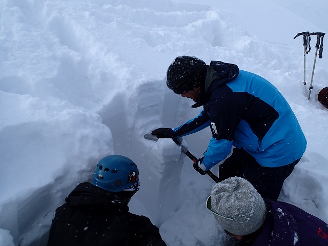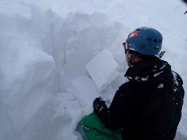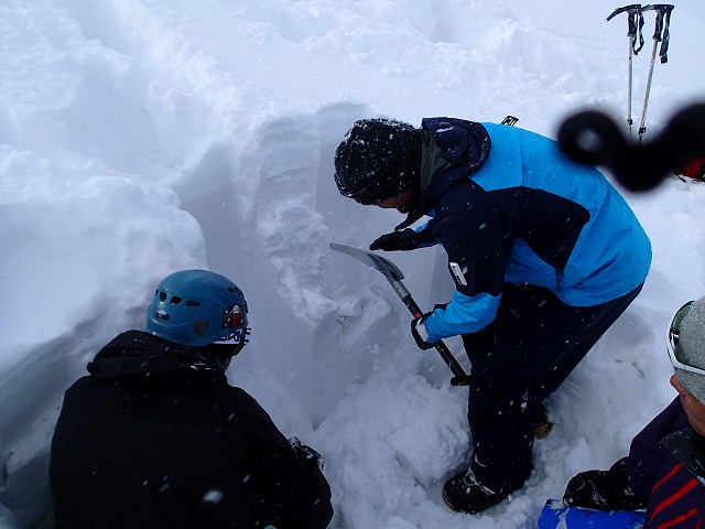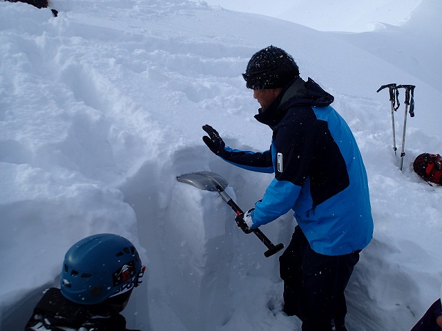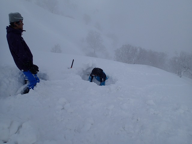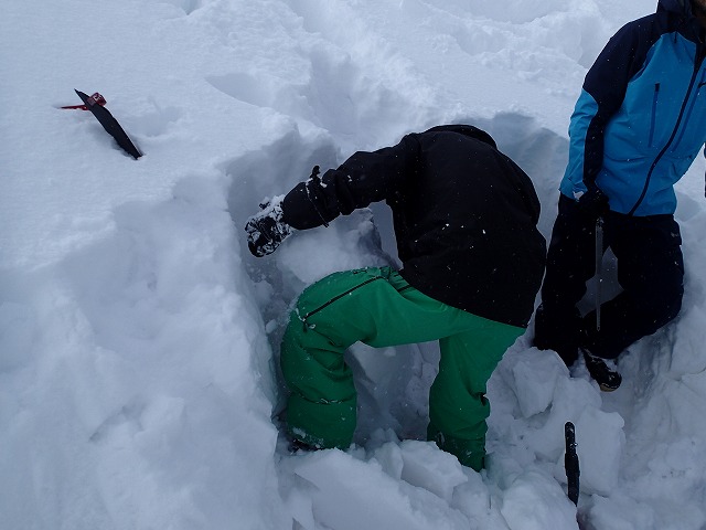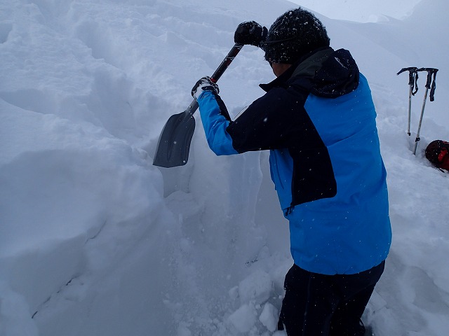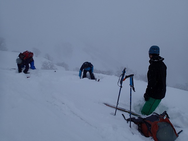 この尾根上で、コンプレッションテストを何回も繰り返し実施しました。大ちゃん・梅さんが再三チェックし今日は、相当深いところに弱層はあるものの、大丈夫だろうと判断。滑降準備を行います。