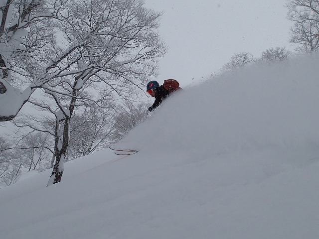 4人でローテーションしながら激深の新雪にトレースをつけていきます。