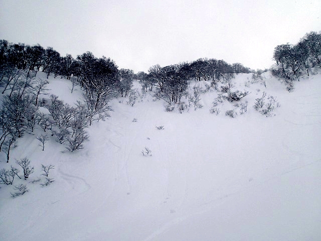 後になってわかったのですが、その喉の部分を天狗蔵君は止まらずに滑降し、ジャンプして大転倒だったとか。