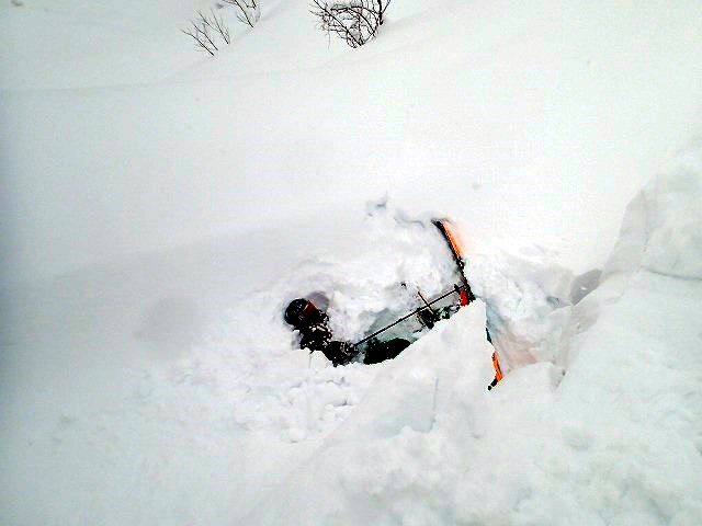 やっとの思いで右にトラバースして通過。私もその上の斜面をトラバースして無事通過しました。