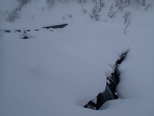 堰堤通過中に、先頭の梅さんが消えました。2mほど下に落下。私たちは、その上をトラバースして通過。梅さんありがとうございました。危険を身をもって知らせてくれました。