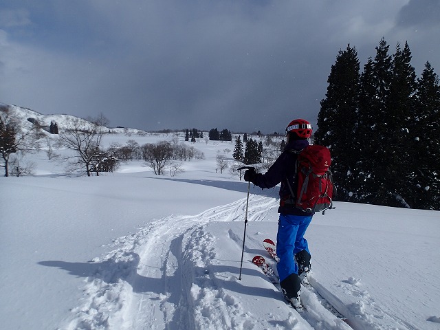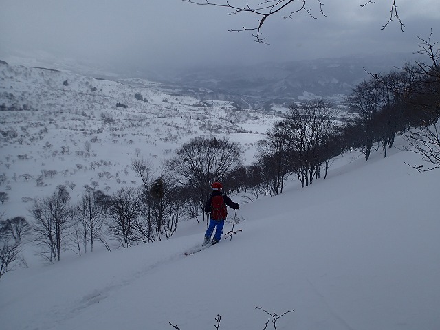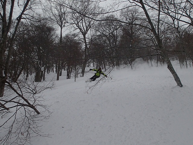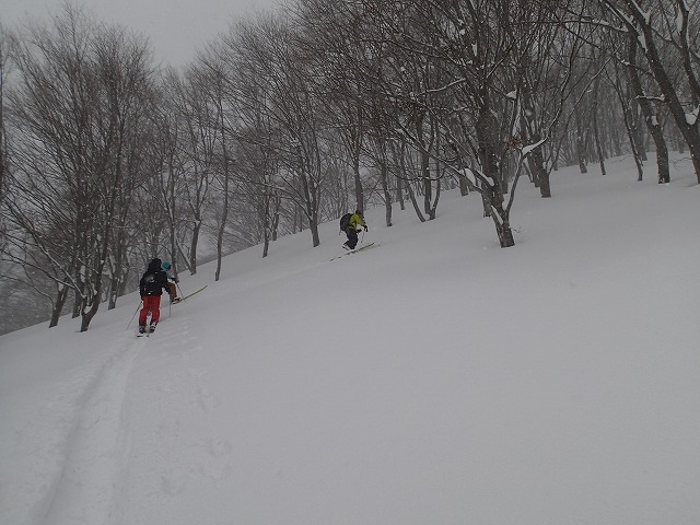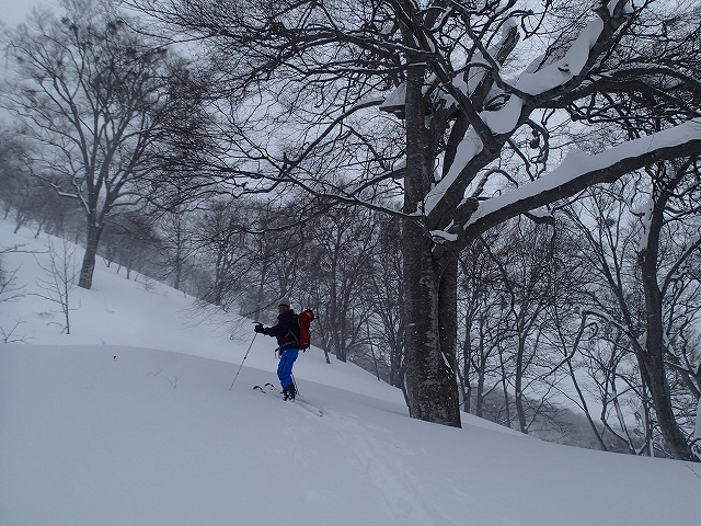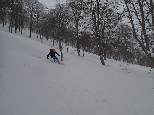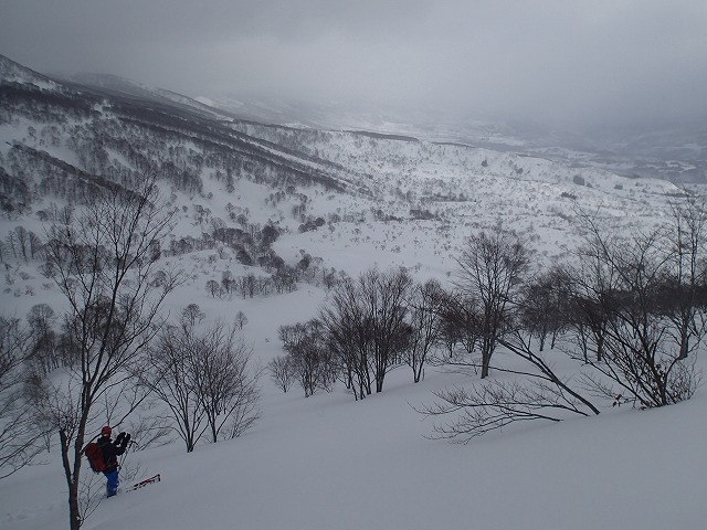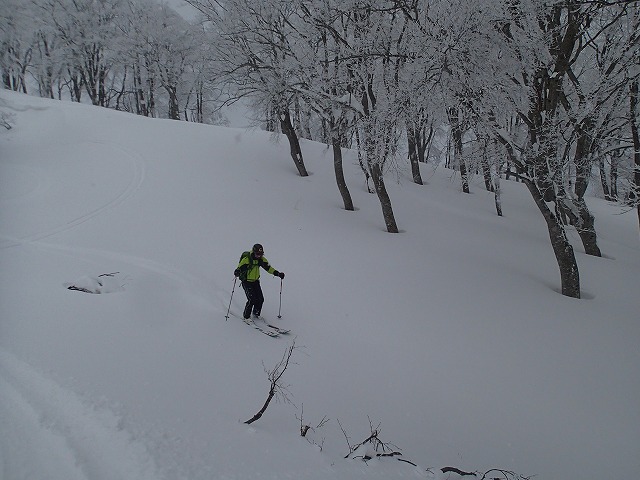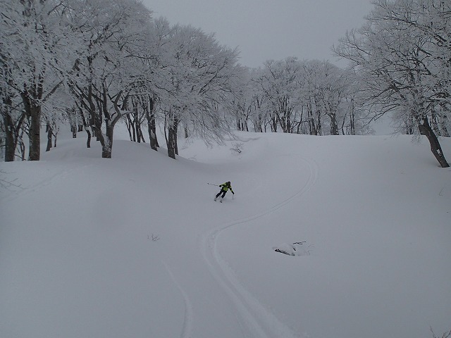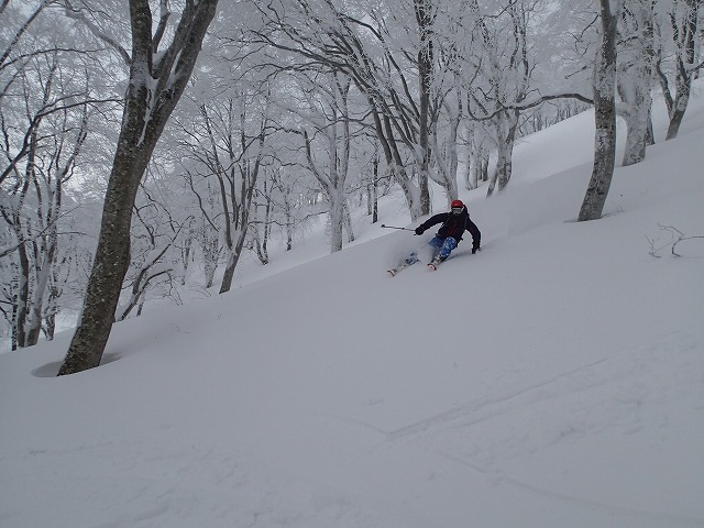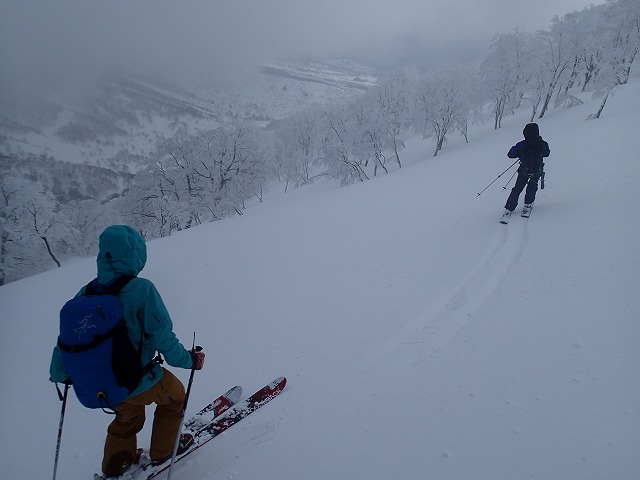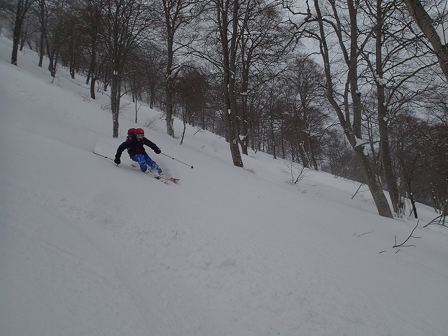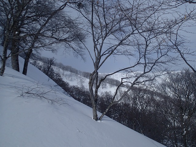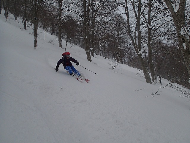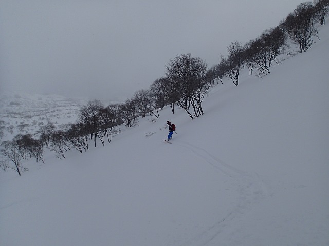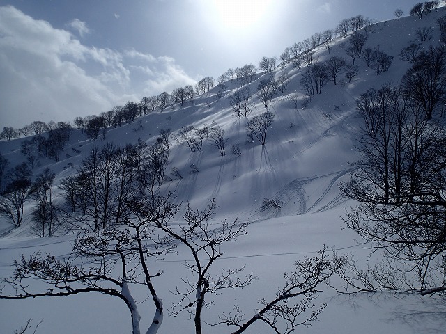ここの斜面は、印象としては、雪崩等が起きずらい斜面のように感じました。(注意は常に必要です。)雪の量は多く、疎林で凹凸も少ないため、楽しい滑降が期待できます。