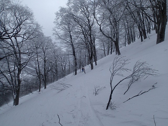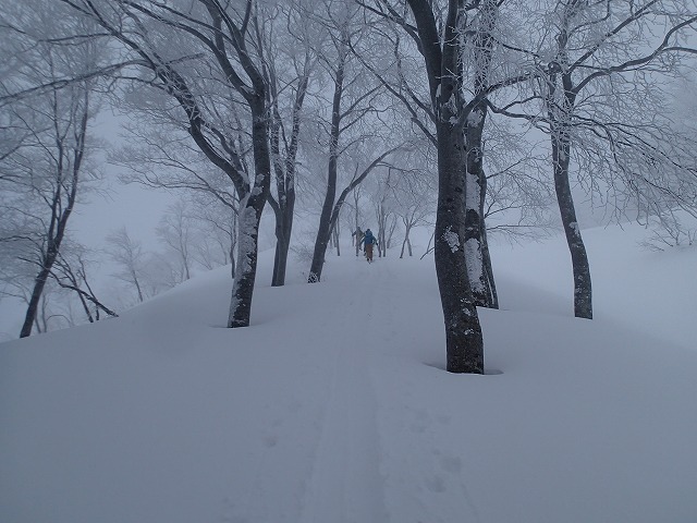 9:11尾根に取り付きます。ここまで富山から来た若い二人が道案内してくれました。お礼を言って私たちが先になります。新雪は、20cmほどでしょうか。あまり苦にはなりません。