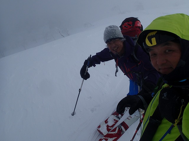 2R目のハイクは、トレースもあるのでハイピッチ。天狗蔵君に久々にスイッチが入りました。2Rの山頂は、天候も回復しています。風も弱く山頂で滑降準備。2R目は、通称ボブスレーコースと名付けられたすり鉢状の尾根を滑降。その後急斜面に突入し、ボトム付近まで滑降します。以外にボトム付近まで降りてもトラバースをかけることができました。