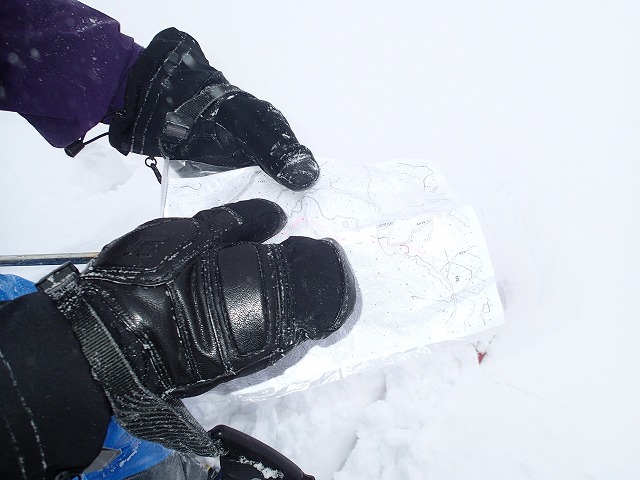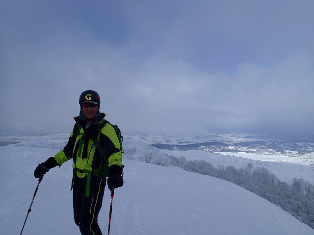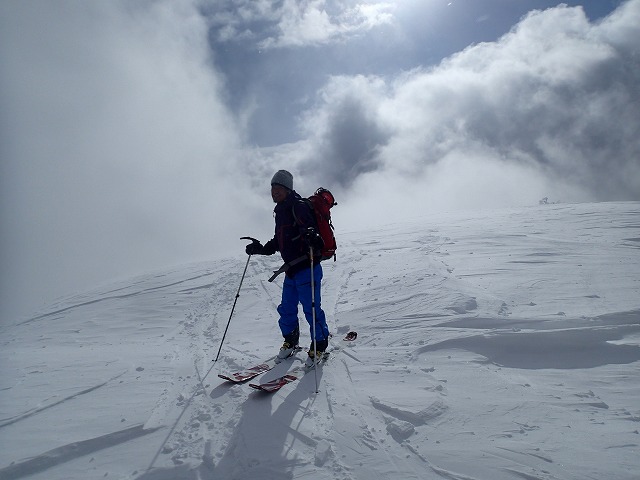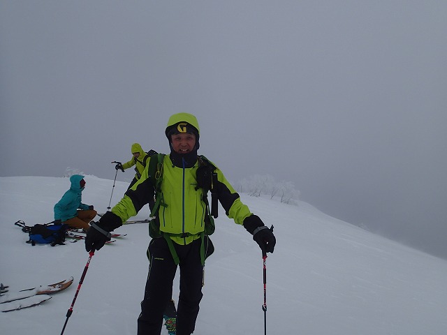 尾根の取り付きから1時間少々で山頂についてしまいました。山頂は風もあり、尾根の陰に隠れて滑降準備をします。どの方面がいい斜面なのか、またまた富山の2人に聞き、彼らが滑降する方向に滑ることにします。