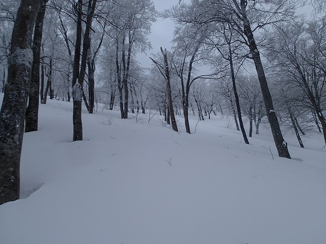尾根は、疎林で傾斜もゆるく、快適なハイクを楽しむことができました。先週の大滝山とは相当違います。ただ、今日は天候が回復するはずですが、一向にその気配はありません。(後でわかったのですが、富山の白木峰は天気が良かったようです。梅さん・大ちゃん達がいっていました。)